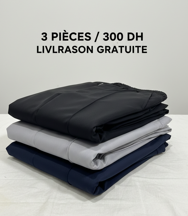 “الباك الأكثر طلباً في المغرب: 3 سراويل كلاسيك بجودة عالية بـ 300 درهم فقط (عوض 450 درهم). اختار مقاسك والألوان اللي بغيتي !”